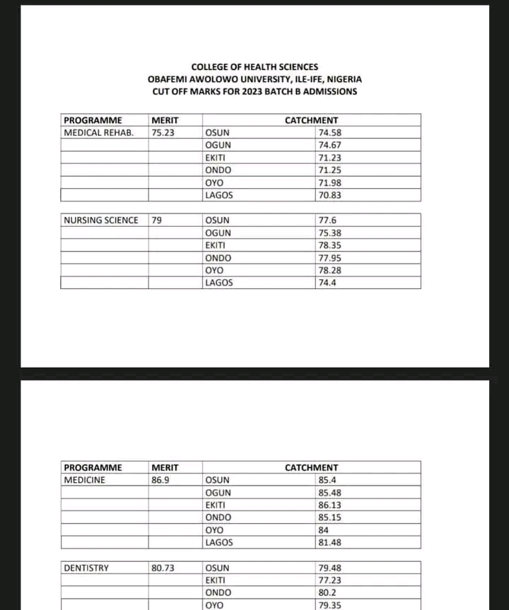 OBAFEMI AWOLOWO UNIVERSITY RELEASES MBBS, NURSING & OTHERS ADMISSION CUT OFF MARK FOR THE 2023/2024 ACADEMIC SESSION